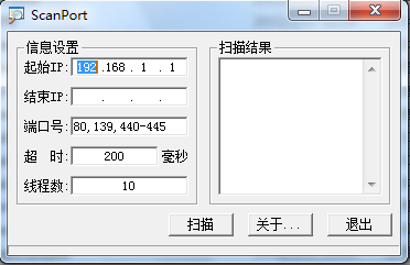 下面是用法介绍,如果你要扫192.168.100.1-254的话,在起始ip填192.168.100.1,结束ip填192.168.100.254,Scanport,可以扫192.0.0.0/8的大网段,当然这个软件也有缺点,如果你设置线程数很多,超时很短,可能会突然间来个卡死,内存占用90%以上,在这危急关头,点一个暂停,所有危机都烟消云散0.0